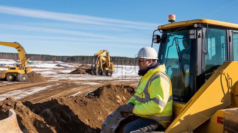 Construction worker resting in front of excavator on the construction site wearing personal protective equipment and a construction outfit with hard hat and sunglasses