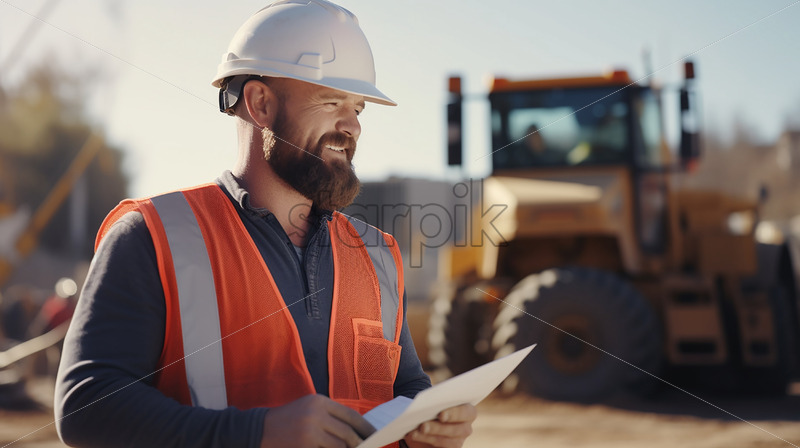 serious construction worker doing his job near the excavator on the construction site wearing construction worker outfitand a construction outfit with hat