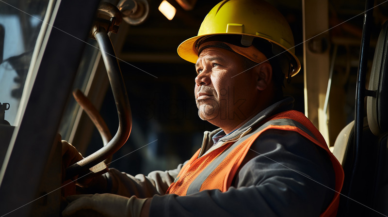 Serious construction worker doing his job driving backhoes wearing personal protective equipment and a construction outfit with hard hat