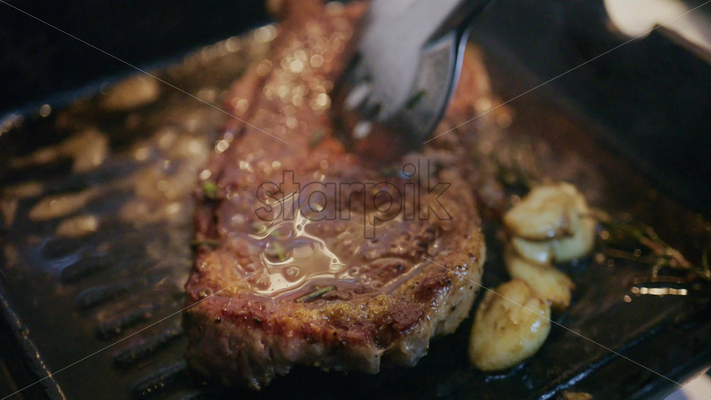 Garlic cloves and butter added to a steak while cooking on a grill pan