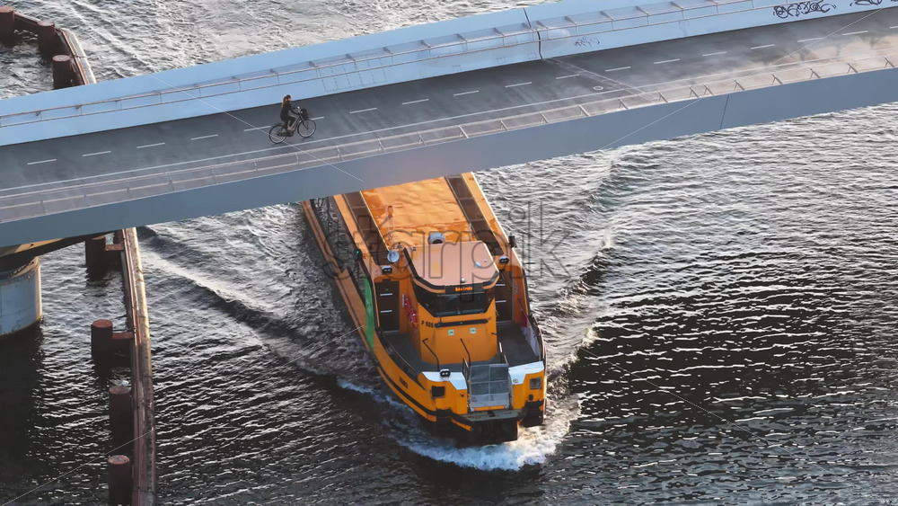 Aerial drone view of a yellow harbor bus passing under the Lille Langebro, cycling and pedestrian bridge in Copenhagen, Denmark Royalty Free Stock Video Footage
