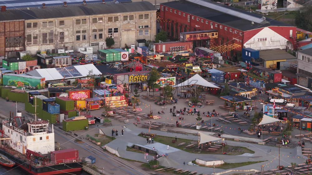 Copenhagen, Denmark – August 4, 2025: Aerial drone view over the lively Reffen street food and cultural market area with warehouses, crowds, and waterfront vibes Royalty Free Stock Video Footage