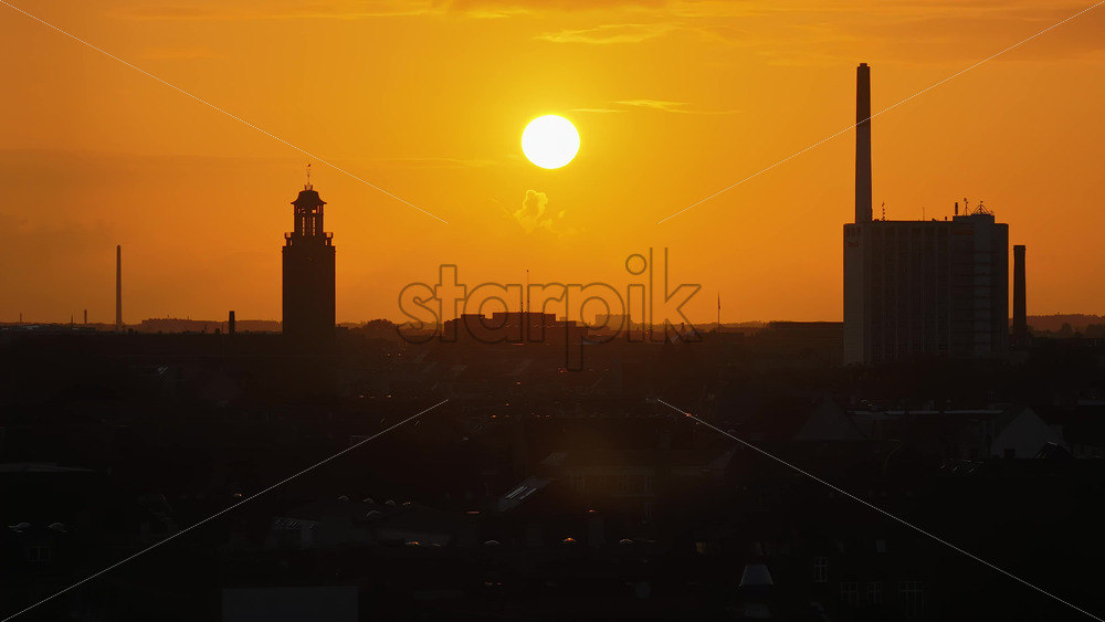 Home » Shop » 1 Video » Video – Copenhagen, Denmark – August 3, 2025: Aerial drone view of the city’s skyline during sunset, with the sun glowing above landmarks and industrial chimneys silhouetted against the orange sky