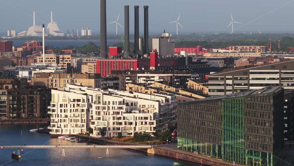 Copenhagen, Denmark – August 3, 2025: Aerial drone view of the Quay Bridge with modern waterfront apartments in Copenhagen, Denmark with canals and wind turbines in the distance Royalty Free Stock Video Footage