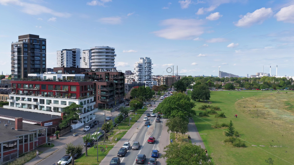 Copenhagen, Denmark – August 4, 2025: Aerial drone view of Amager Faelled green fields with the Orestad residential towers on the left and CopenHill ski slope in the distance Royalty Free Stock Video Footage