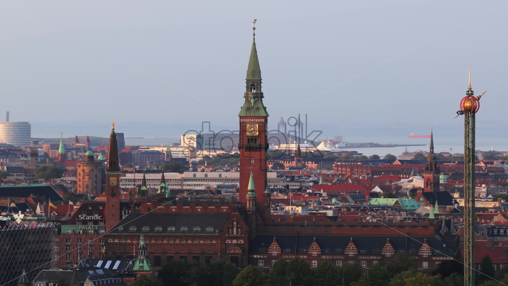 Copenhagen, Denmark – August 4, 2025: Aerial drone view of Copenhagen’s historic red-brick City Hall tower with Tivoli Gardens’ rides and the harbor in the background Royalty Free Stock Video Footage