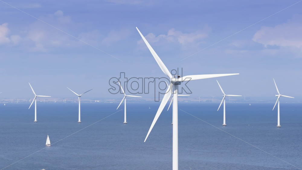 Copenhagen, Denmark – August 4, 2025: Aerial drone view of offshore wind turbines spinning in the sea at the Oresund Wind Farm Royalty Free Stock Video Footage