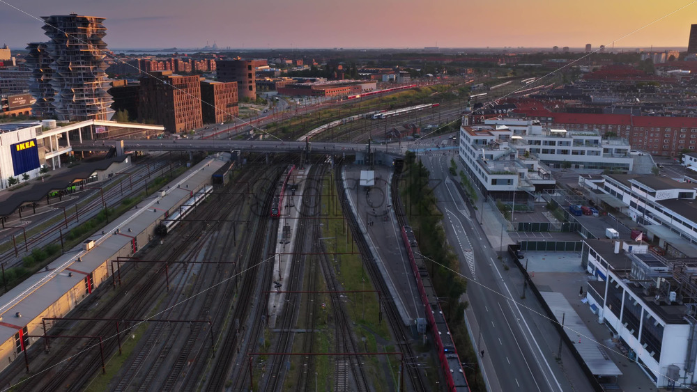 Aerial drone view of railway lines and rooftops in Vesterbro with the sun setting behind modern towers in Copenhagen, Denmark Royalty Free Stock Video Footage
