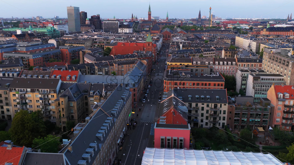 Copenhagen, Denmark – August 4, 2025: Aerial drone view of Norrebrogade, one of the busiest streets in Norrebro, looking towards the city center skyline at sunset Royalty Free Stock Video Footage