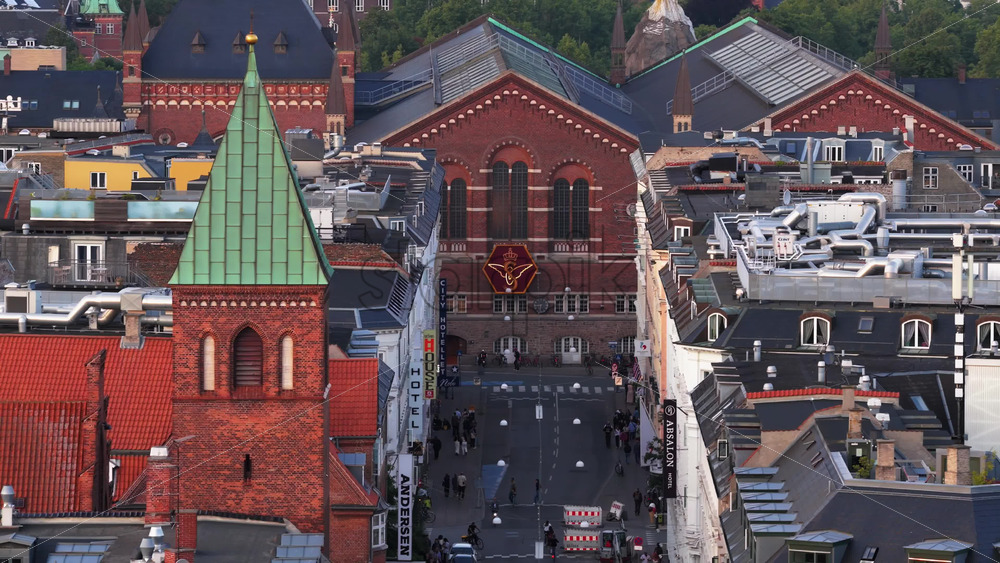 Aerial drone view over historic brick buildings and busy streets in the Vesterbro neighborhood Royalty Free Stock Video Footage