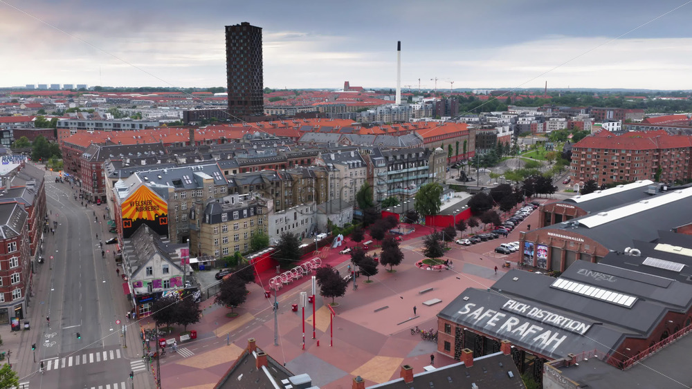 Copenhagen, Denmark – August 4, 2025: Aerial drone view of Superkilen Park with its signature red square and the Norrebrohallen cultural center Royalty Free Stock Video Footage