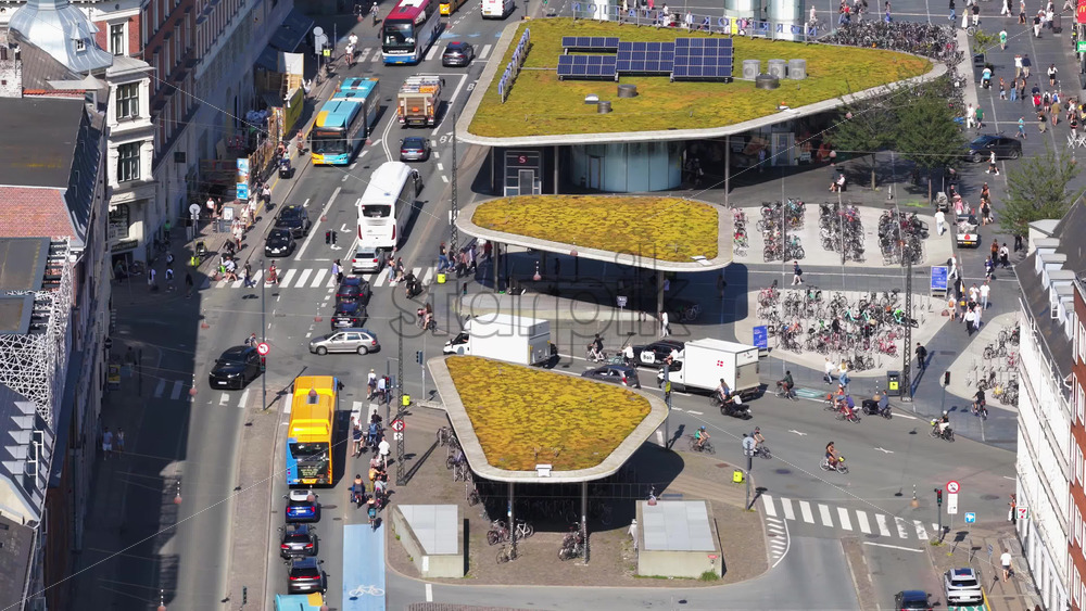 Copenhagen, Denmark – August 7, 2025:Aerial drone view of city traffic, cyclists, and modern green-roofed bike pavilions at Norreport Station Royalty Free Stock Video Footage