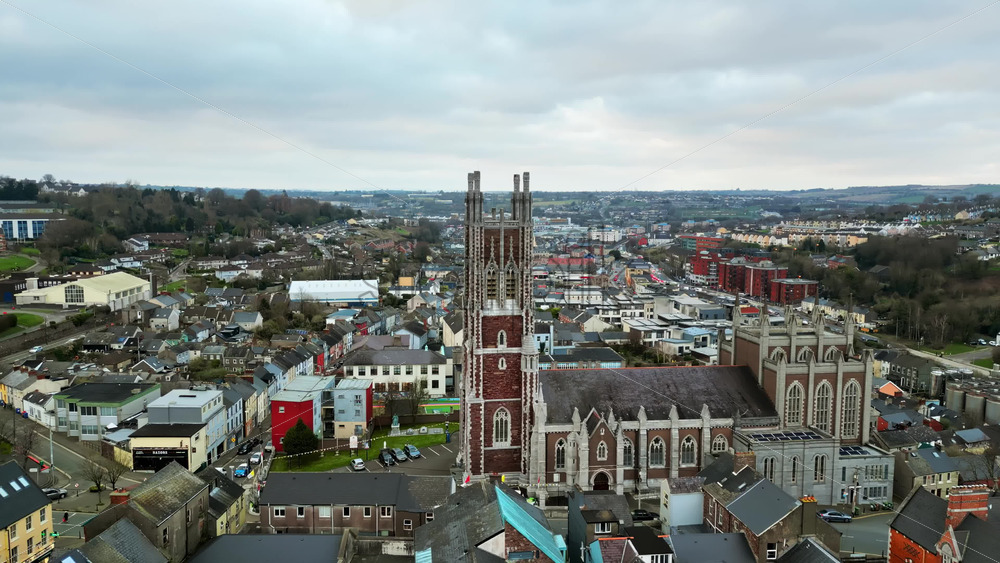 Aerial drone view of the colourful houses surrounding the St Colman’s Cathedral in Cork, Ireland Royalty Free Stock Video Footage