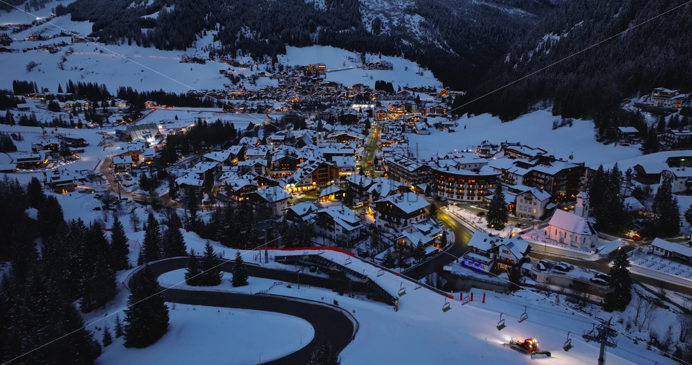 Corvara in Badia, Italy – January 9, 2025: Aerial drone view of the Corvara village covered in snow at night, in South Tyrol, Dolomites, in northern Italy Royalty Free Stock Video Footage