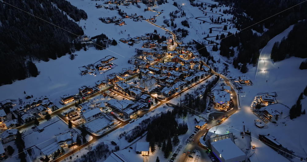 Corvara in Badia, Italy – January 9, 2025: Aerial drone view of the Corvara village covered in snow at night, in South Tyrol, Dolomites, in northern Italy Royalty Free Stock Video Footage