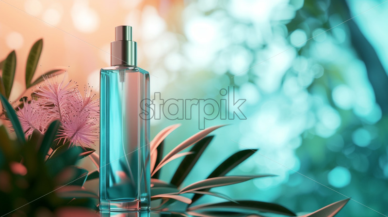 Blank perfume bottle, fresh water, spring vibes on background