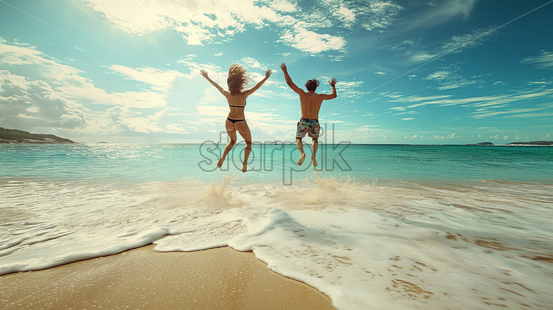Home » Shop » AI Illustration » Couple at the beach happy jumping