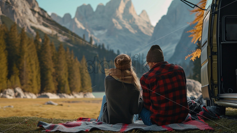 A hugging couple inside transparent bubble tent at glamping while sitting on the bed. Lush forest on the background
