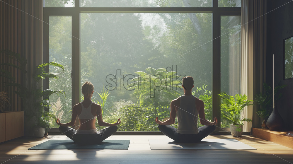 A woman smiles with closed eyes, practicing morning yoga amidst others in the blur of sunrise, basking in the warm morning sunshine from behind.