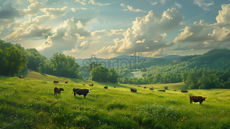 A cow looking into the camera with chain on the neck, water, fields and hills on the background in Moldova