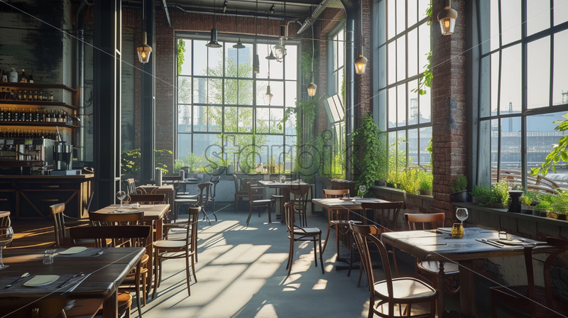 Modern Cozy Cafe architecture in the city in clear glass wall with white table and a rustic color chair with some indoor plants