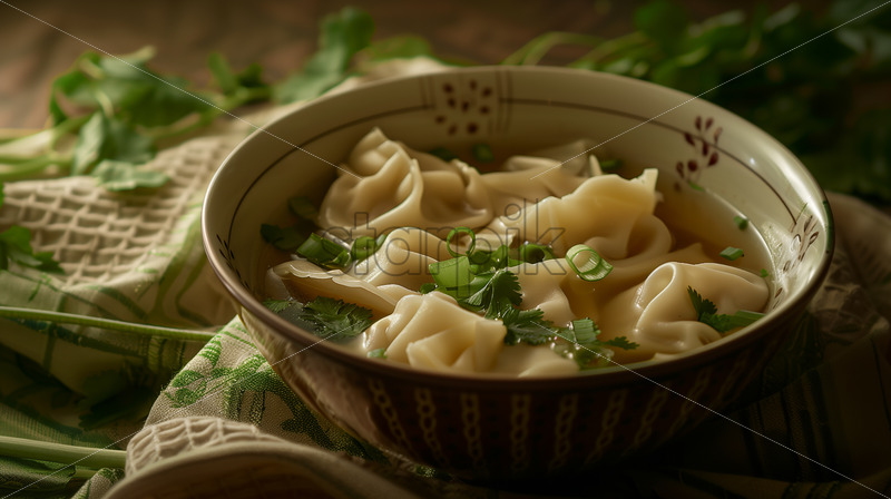 A bowl of wonton soup placed on a cozy tablecloth, garnished with fresh cilantro and thinly sliced green onions.