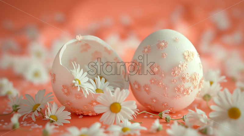 Easter postcard with pastel-colored easter eggs surrounded by cherry blossoms