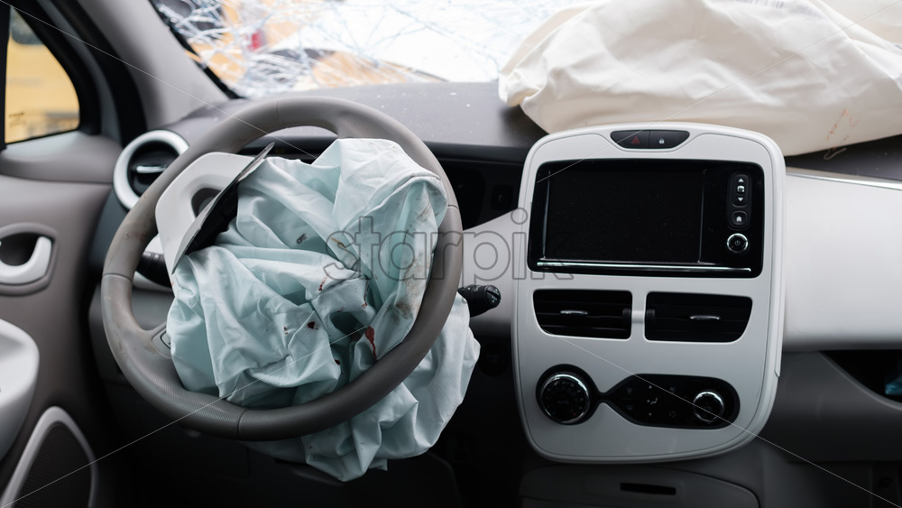 Home » Shop » photo » Crashed electric car in severe accident, frontal impact. Safety idea