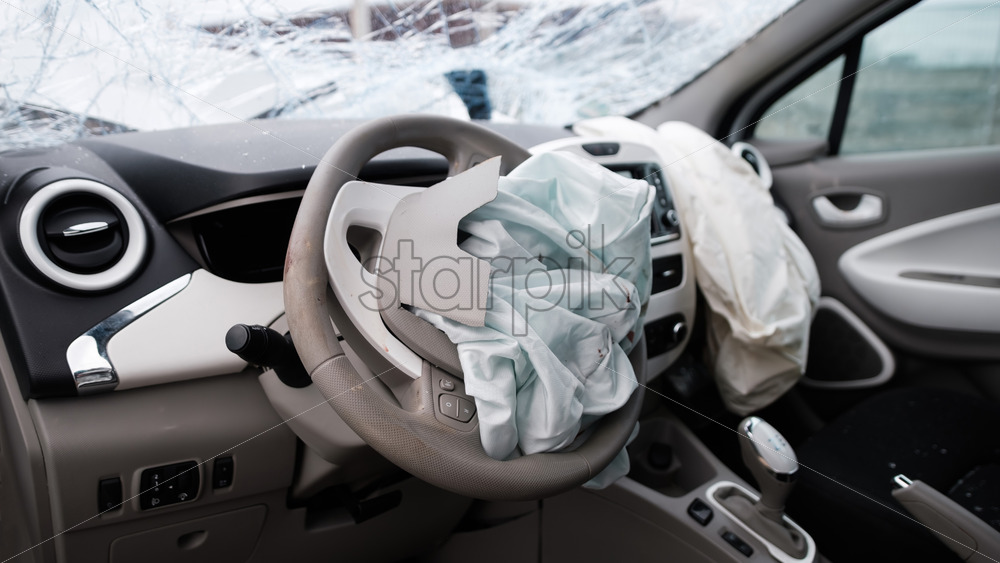 Home » Shop » photo » Crashed electric car in severe accident, frontal impact. Safety idea