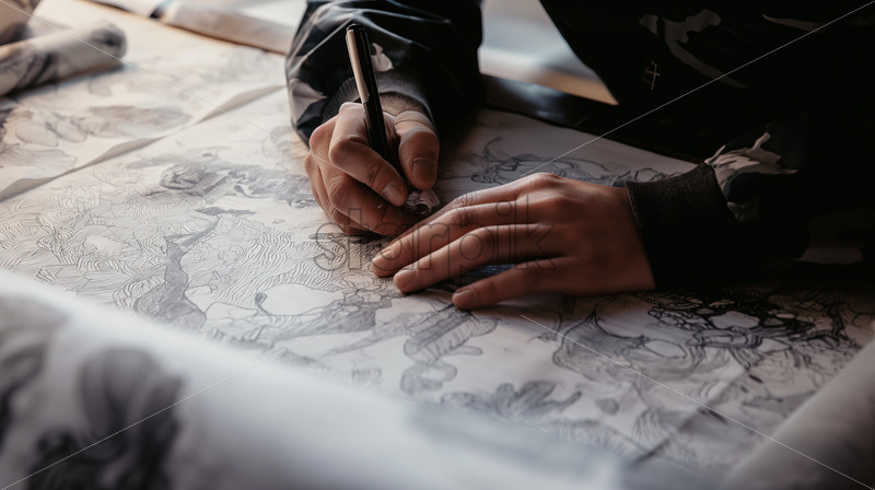 A creative outdoor apparel designer working on intricate fabric patterns in a design studio.