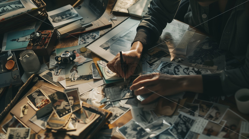 A close-up of a person immersed in scrapbooking, surrounded by vintage photos and materials.