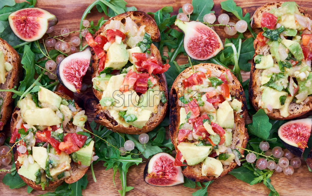 Crispy bruschetta with tomatoes, avocados and basil. Wooden plate ornated with fruits. View from top Royalty Free Stock photo