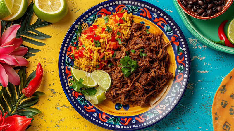 Cuban culinary delight with Ropa Vieja elegantly presented on a colorful plate, accompanied by a side of rice and black beans.