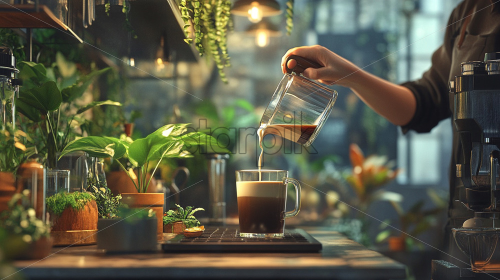 a cozy cafe wood furniture and green view