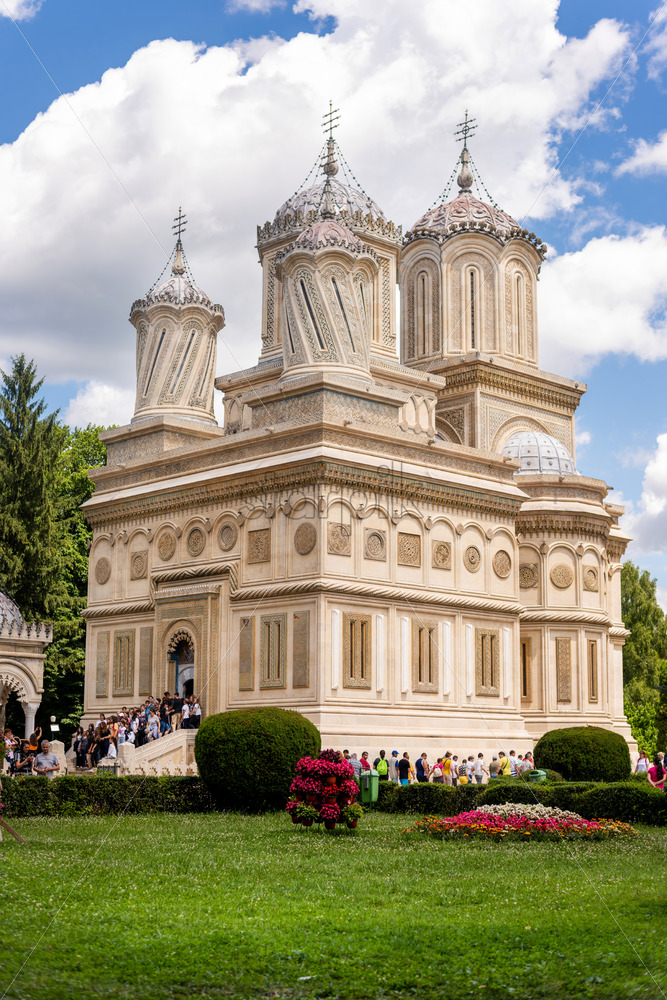 CURTEA DE ARGES, ROMANIA – JULY, 2022: Curtea de Arges Monastery. Main cathedral facade, greenery and people. Vertical view