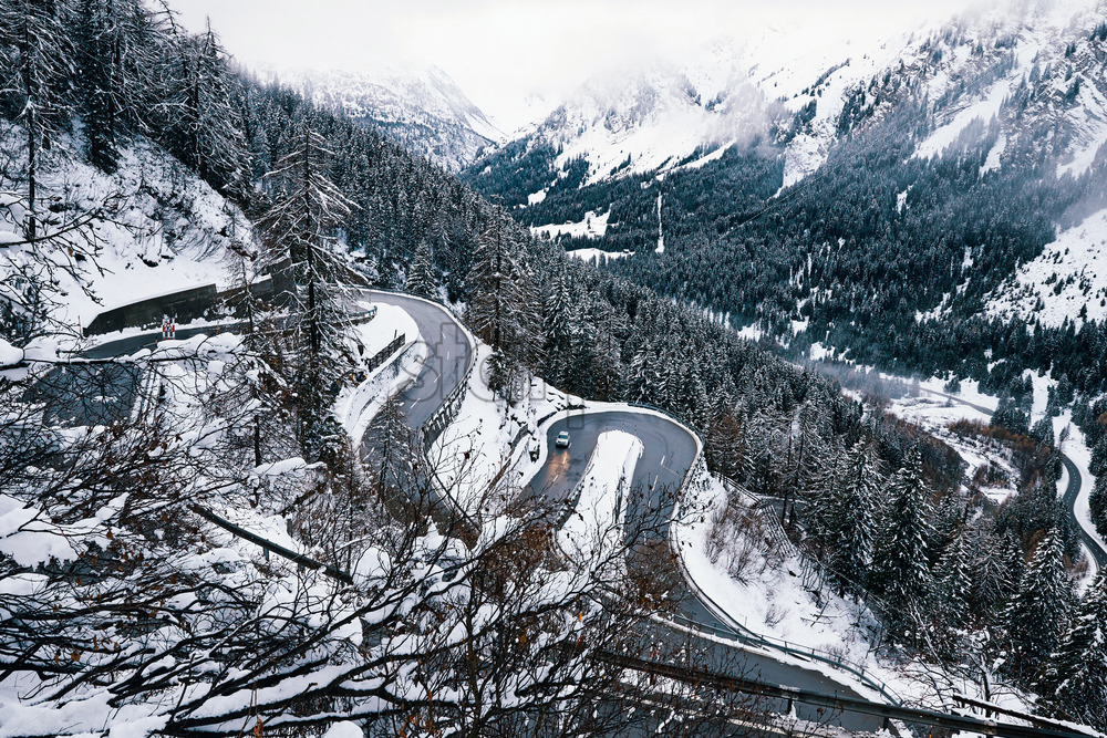 Home » Shop » photo » Curved road in the mountains covered in snow. Switzerland