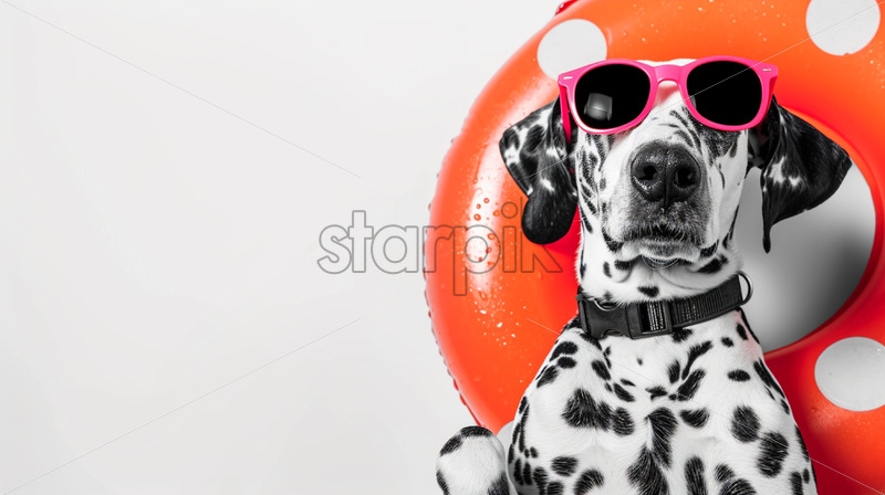 Home » Shop » Uncategorised » Cute dalmatian dog wearing neon sunglasses and an swimming circle on a white background