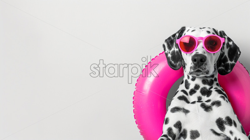 Home » Shop » Uncategorised » Cute dalmatian dog wearing neon sunglasses and an swimming circle on a white background