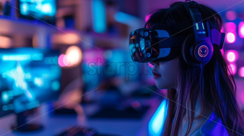 Home » Shop » Uncategorised » Cute girl with VR glasses, streamer’s workplace
