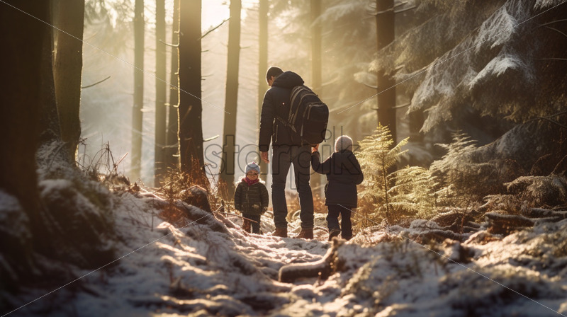 Dad and kids winter time, spending time together outdoors, walking in a forest