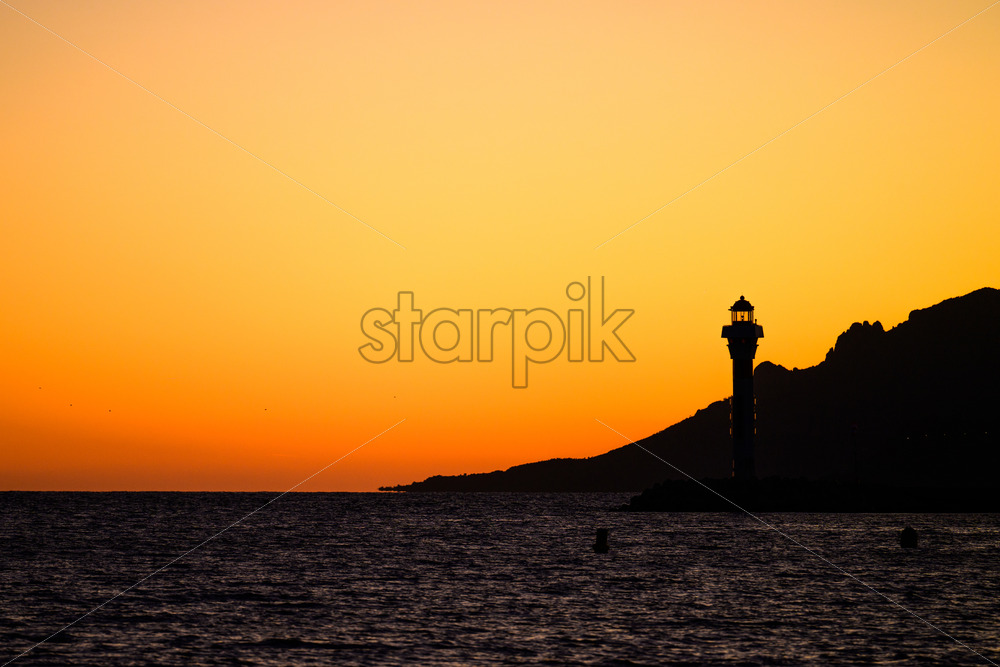 Dark orange red sunset with lighthouse and mountains in Cannes, France