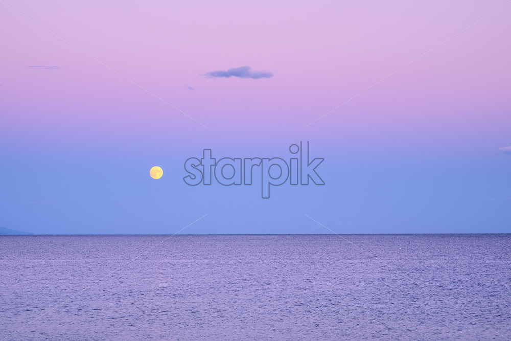 Dark purple sky with yellow moon over sea after sunset in Greece