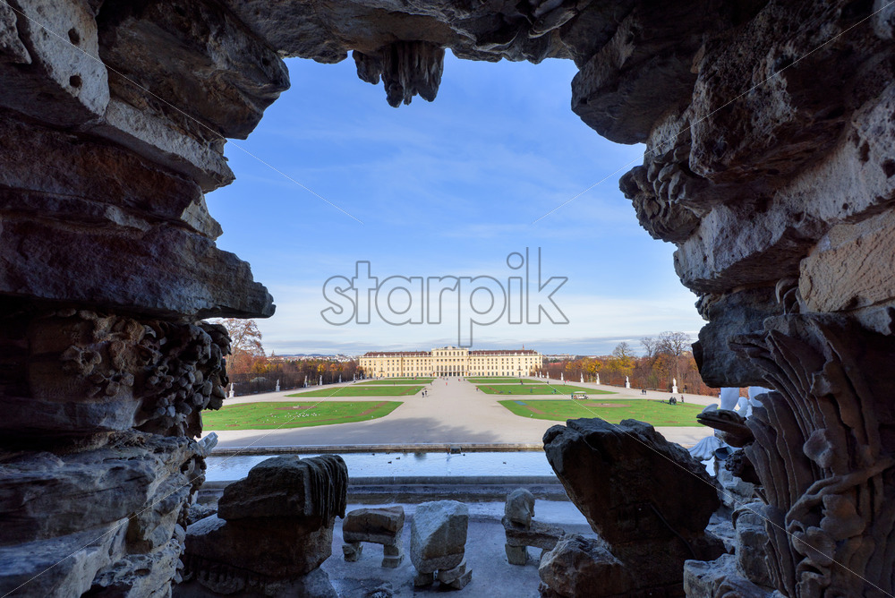 Dark view from old ancient rocks to Schonbrunn Palace gardens with tourists in bright clear day