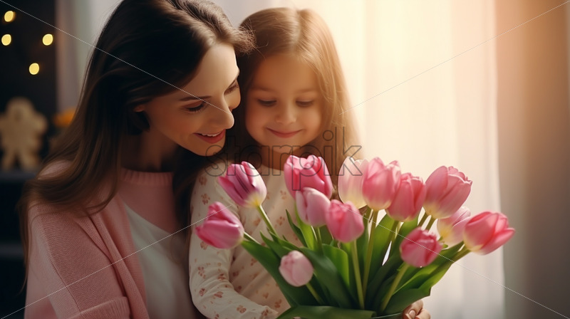 Daughter congratulates her mother and gives her a bouquet of tulips