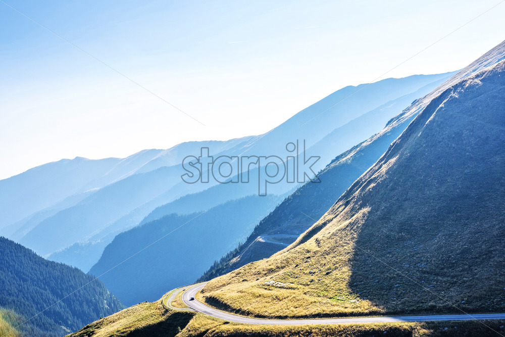 Daylight aerial view from top to winding road with car riding on it. Silhouette of Mountains in fog on background. Bright blue clear sky. Negative copy space, place for text. Transfagarasan, Romania Royalty Free Stock photo