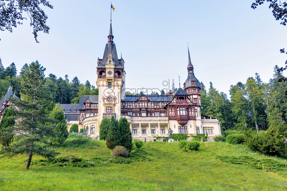 Peles Castle at daylight. Clouds on background. Wide shot. Sinaia, Romania