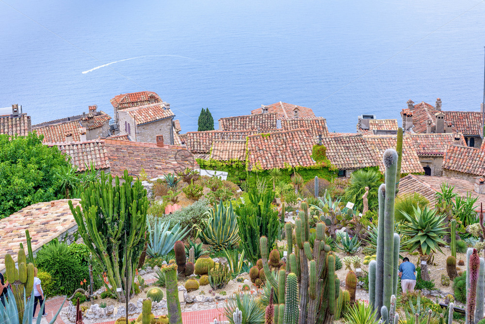 Daylight foggy view to Eze village with botanical garden full of cactuses. Beauties of French Riviera