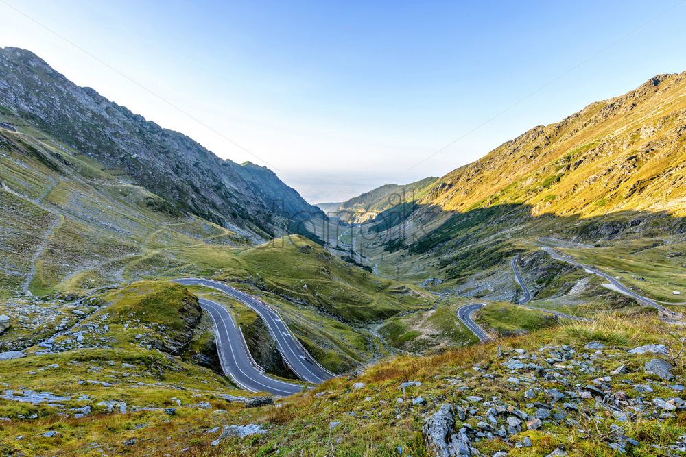 Daylight landscape view from top to winding road with green mountains. Bright blue clear sky. Negative copy space, place for text. Transfagarasan, Romania Royalty Free Stock photo