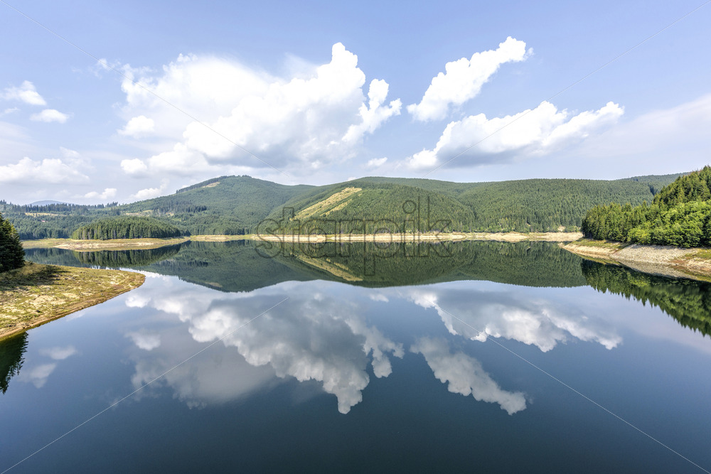 Daylight misty view to Oasa dam lake with mountains full of green trees and bright clear sky. Image reflecting on water. Negative copy space, place for text. Sebes, Romania Royalty Free Stock photo