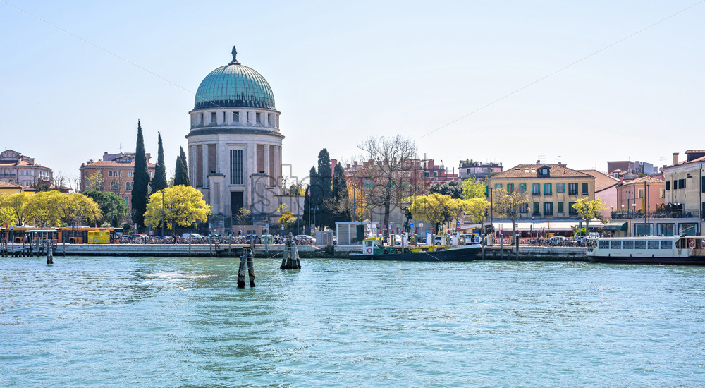 Daylight panoramic wide view from venetian lagoon to The Lido Of Venice church and a part of city. Bright blue clear sky. Negative copy space, place for text. Venice, Italy